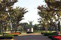 ゲートの外には、公園のシンボルツリーでもある、ケヤキがあり、ゲートをくぐると、目の前に広がるふれあい広場までの通路はケヤキ並木になっています。