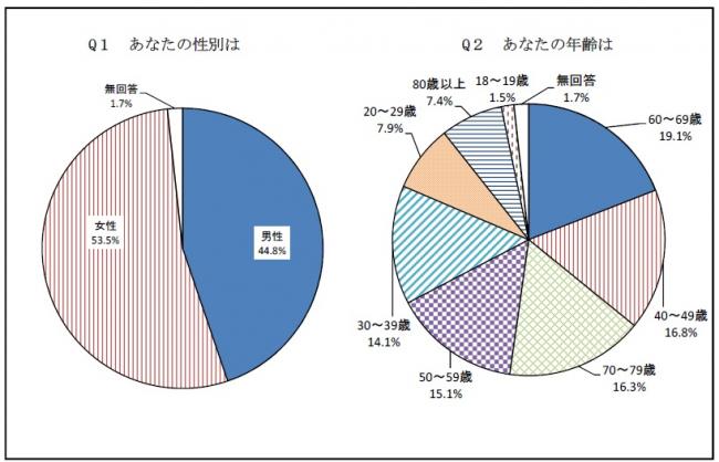 年齢別では、「60~69歳」が19.1%と最も多く、次いで「40~49歳」16.8%、「70~79歳」16.3%、「50~59歳」15.1%、「30~39歳」14.1%、「20~29歳」7.9%、「80歳以上」7.4%、「18~19歳」1.5%、「無回答」1.7%となりました。