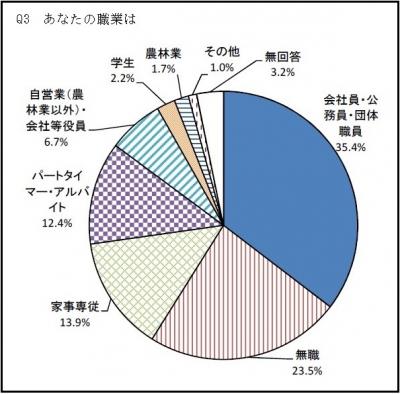 職業は、「会社員・公務員・団体職員」35.4%、「無職」23.5%、「家事専従」13.9%、「パートタイマー・アルバイト」12.4%、「自営業(農林業以外)・会社等役員」6.7%、「学生」2.2%、「農林業」1.7%、「その他」1.0%となりました。